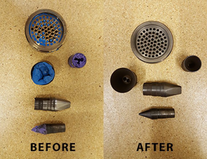 Components such as dies, breaker plates, nozzles, extrusion heads and filters often contain narrow channels that are difficult to clean mechanically or chemically.